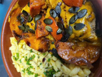 Schweinefilet angebraten mit Kürbisstreifen in Kürbissoße, dazu Spätzle