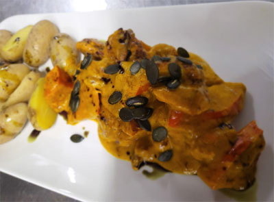 Hähnchengeschnetzeltes mit Kürbisstreifen in Kürbissoße mit Drillingskartoffeln